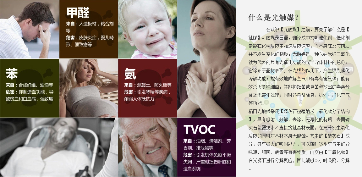在認識【光觸媒】之前,要先了解什么是【觸媒】。觸媒是日語,翻譯成中文叫催化劑。催化劑是能在化學反應中加速反應速率,而本身在反應前后并不發(fā)生變化的物質(zhì)。光觸媒是一種以納米級二氧化鈦為代表的具有光催化功能的光半導體材料的總稱。它涂布于基材表面,在光線的作用下,產(chǎn)生強烈催化降解功能:能有效地降解空氣中有毒有害氣體;能有效殺滅多種細菌,并能將細菌或真菌釋放出的毒素分解及無害化處理;同時還具備除臭、抗污、凈化空氣等功能。 稻田光觸媒采用【磷灰石被覆納米二氧化鈦分子結(jié)構(gòu)】,具有吸附、分解、去除、無毒化的特質(zhì)。表面磷灰石包覆技術不直接接觸基材表面,在充分發(fā)生氧化反應的同時對基材本身無腐蝕。其中的【磷灰石】成分,具有強大的吸附能力,可以隨時吸附空氣中的異味源、細菌、病毒等有害物質(zhì),再交由【二氧化鈦】在光源下進行分解反應,因此能夠24小時吸附、分解